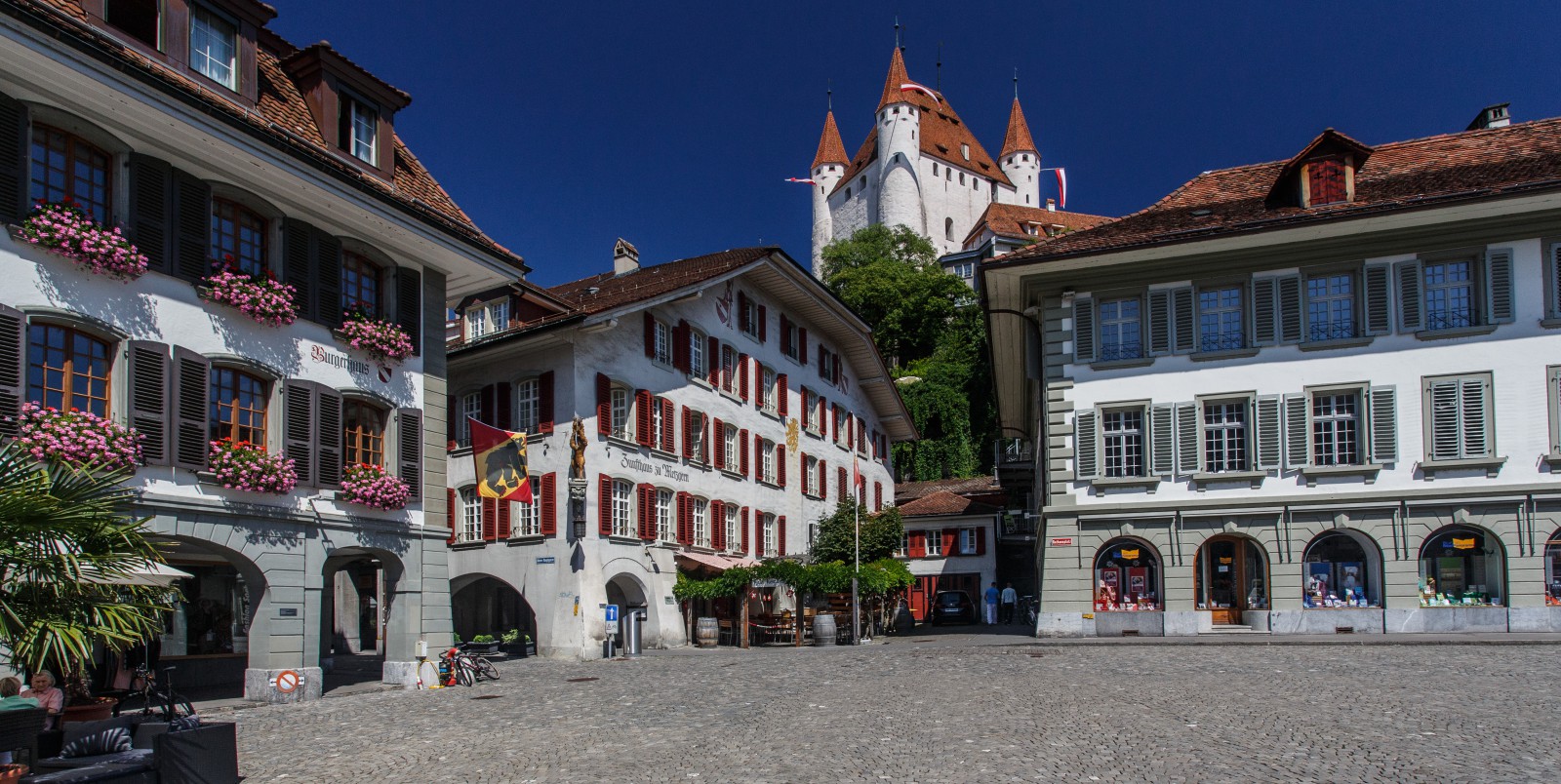 The idea was to capture the flavour of Thun, Switzerland. It is a very picturesque town, mostly dominated by the Schloss (castle) on the hill. The client sent a low res image taken from the Rathausplatz (city hall square) as an idea.